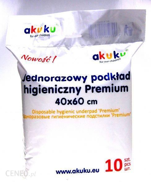 AKUKU JEDNORAZOWE PODKADY HIGIENICZNE PREMIUM 40×60 cmWskazania:Jednorazowe podkadu higieniczne Premium Akuku to niezwykle praktyczny wyrb, ktry mona stosowa podczas przewijania dzieci, do zabezpieczenia materaca, fotelika samochodowego czy wzka przed przemoczeniem. Doskonale sprawdza si rwnie przy pielgnacji osb obonie chorych, w przypadku osb z problemem nietrzymania moczu, kobiet w okresie poogu lub jako dodatkowa ochrona pocieli szpitalnych. Jest to produkt niezastpiony w przypadku opieki paliatywnej oraz domowej.Waciwoci:Akuku Podkady higieniczne Premium o wymiarach 40×60 cm to produkt jednorazowego uycia, ktry wykonany jest z omiu warstw (wknina – sze warstw bibuy – folia). Skutecznie zabezpiecza przed przesikaniem i jest odpowiedni do stosowania juz od 1. dnia ycia. Podkady jednorazowe Premium Akuku zapewniaj poczucie higieny i komfortu. Zastosowana w nich folia zewntrzna chroni przed zabrudzeniami, a wodoodporna warstwa izolacyjna znajdujca si na spodzie podkadu zapobiega przesikaniu pynw na materac/przewijak. Wewntrz podkadu zastosowano za superabsorbent, ktry szybko wchania wilgo oraz neutralizuje nieprzyjemne zapachy. Podkady charakteryzuj si wysok chonnoci 400 ml i dugim okresem przydatnoci a 60 m-cy. Celem zapewnienia higieny naley pamita o ich czstym zmienianiu.Opakowanie:10 sztuk
