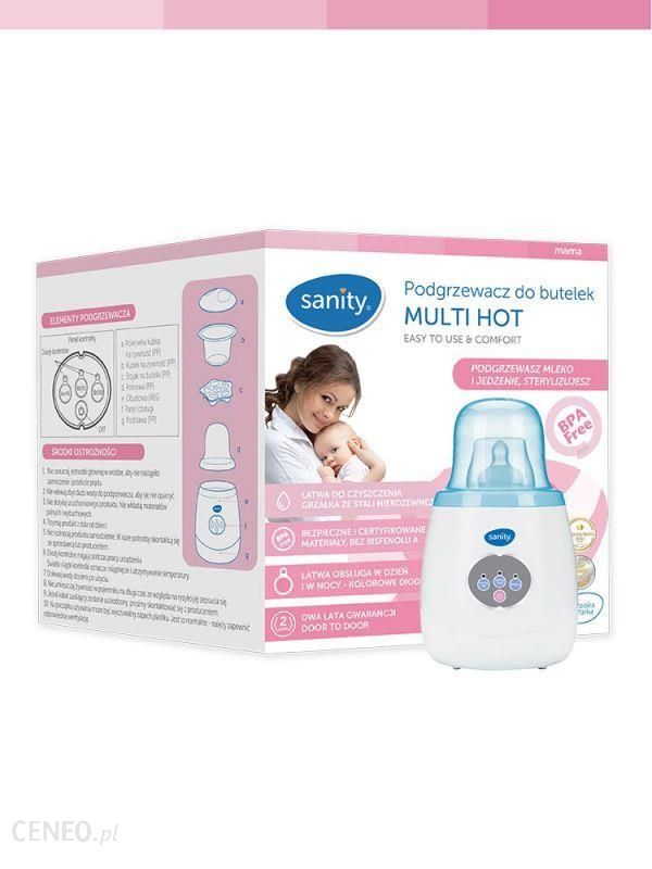 Podgrzewacz do butelek Sanity MULTI HOT, do podgrzewania i sterylizacjiPodgrzewacz do butelek Sanity umożliwia szybkie podgrzanie pokarmu dla dziecka do odpowiedniej dla niego temperatury. Urządzenie jest łatwe w użyciu, dlatego można korzystać z niego w sposób intuicyjny.Cechy produktu:Podgrzewanie mleka do temperatury 40 stopniPodgrzewanie pokarmu do temperatury 70 stopniSterylizacja smoczków, butelek oraz innych akcesoriów do jedzenia dla dzieckaBardzo łatwe w użyciuMożna łatwo obsługiwać go w nocy dzięki kolorowym diodomSpecyfikacja techniczna:Napięcie: 230 VCzęstotliwość: 50 HzMoc: 100 W