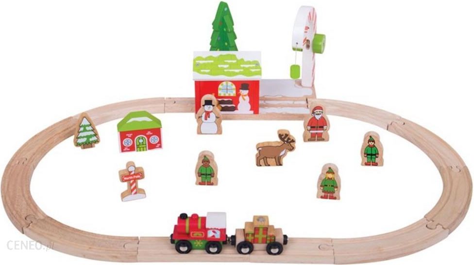 Bigjigs Drewniana kolejka świąteczna BJT066Kolejki drewniane Bigjigs Rails to jedna z największych serii systemów kolejki drewnianej na świecie. Oferuje ponad 150 produktów, w tym zestawy kolejek, pociągi, lokomotywy i wagoniki oraz stoły do kolejek i wiele więcej akcesoriów potrzebnych do stworzenia nawet najbardziej wyszukanej sieci kolejowych. Produkty są kompatybilne z innymi kolejkami i akcesoriami między innymi takich marek jak: Brio, IKEA, ELC, Little Steps, Eichhorn, Woodyland.Święta zawitały do świata Bigjigs! Małych entuzjastów z pewnością zachwyci świąteczna kolejka. Magiczny pociąg zaczyna przygodę w fabryce zabawek gdzie elfy za pomocą dźwigu ładują zabawki. Następnie kolejka rozwozi w koło prezenty grzecznym dzieciom by na koniec z powrotem wjechać w tunel.Zestaw wzbogacony jest o figurki: Świętego Mikołaja, bałwanka, trzy elfy, renifera, domek, choinkę oraz drogowskaz wskazujący północ.Wiek: 3+