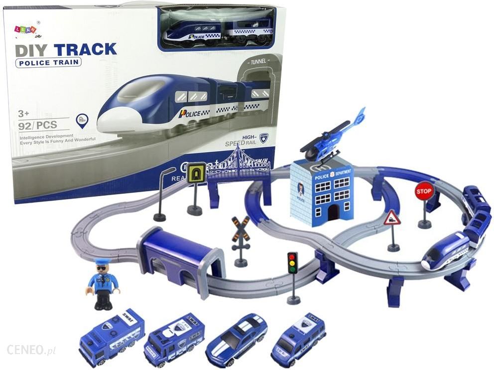 Zestaw Miasteczko Policja Pociąg Niebieski 203 km/h Duży zestaw składający się z 92 elementów, dzięki któremu możesz stworzyć własny miasteczko policji z własnym torem dla pociągów i cieszyć się zabawą. Wspólny czas spędzony na budowaniu trasy dla pociągów, a także rozkładaniu elementów infrastruktury i tworzeniu ciekawych scenariuszy zabaw będzie doskonałą zabawą zbliżającą do siebie członków rodziny.Maluchy uwielbiają zabawki wielofunkcyjne i dodatkowo wcielanie się w rolę, które pozwolą dać upust ich wyobraźni i dają wiele możliwości. Wykonany z najwyższej jakości materiałów produkt zagwarantuje bezpieczeństwo i komfort Twój maluch poczuje się jak prawdziwy policjant, będzie mógł przygotowywać się we własnej bazie na akcje policyjne. Idealna zabawka dla pozytywnego rozwoju Twojego dziecka !Miasteczko policji posiada bazę policji, 5 pojazdów i tory. Wszystko utrzymane w niebieskim kolorze. Pociąg na baterie porusza się z prędkością 203 km/h.Elementy zestawu:- elementy do złożenia toru- 5 pojazdów: helikopter i 4 pojazdy policyjne- pociąg z dwoma wagonami- znaki drogowe- most- baza policji- tunel- figurka policjanta-instrukcja montażuWymiary opakowania: 53 cm x 36 cm x 8 cmZabawka przeznaczona dla dzieci powyżej 3 roku życia. Zasilana czterema bateriami 1,5 V AAA, brak w zestawie. Wykonana z bezpiecznego materiału.