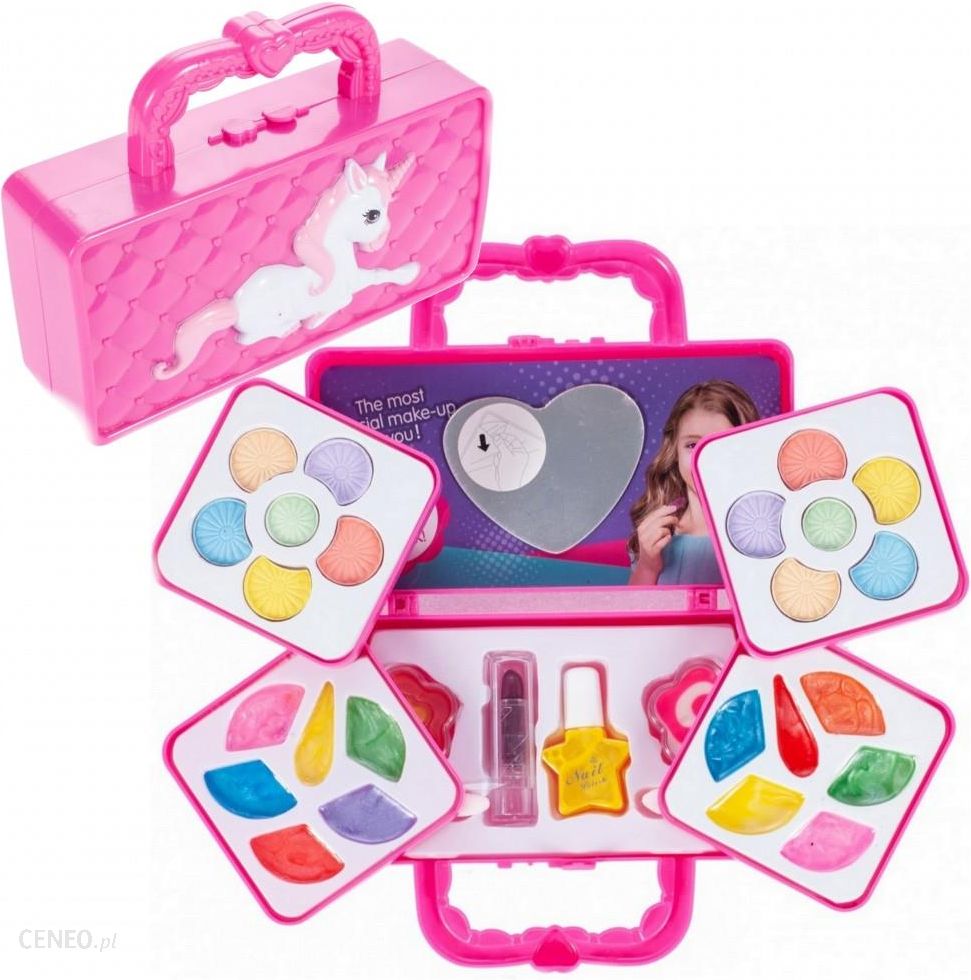 Zestaw do makijażu dla małych dziewczynekOto duży zestaw do makijażu dla dzieci, w którym kilkulatki znajdą wiele akcesoriów do „przepięknej zabawy”.A co dokładnie?kolorowe cienie do powiek;barwne i pachnące błyszczyki do ust;żele z brokatem;pomadkę do ust;lakier do paznokci;akcesoria. Najlepsze w tym wszystkim jest jednak to, że kosmetyki są zapakowane w praktyczne, rozkładane pudełko. W jego wnętrzu znajduje się także lusterko.Wszystko można wygodnie i efektownie przenieść, bo pudełko zamienia się w różową torebkę z magicznym jednorożcem.Make up dla dzieci a bezpieczeństwoKosmetyki są w pełni bezpieczne, zawierają delikatne składniki, dostosowane do młodej skóry. Ponadto, łatwo i szybko je usunąć. To wygodna alternatywa dla tych, którzy narzekają na to, że maluch podbiera im kosztowne akcesoria do makijażu. Drogie Mamy, naprawdę warto zaopatrzyć się w ten zabawkowy zestaw.W zestawie znajduje się:12 cieni do powiek14 błyszczyków2 pacynki do malowania1 lakier do paznokci1 pomadkaLusterkoW zestawie do makijażu znajdziesz:lakier do paznokcipomadkębłyszczykicienie do oczużele brokatoweróżeParametry:Wymiar rozłożonego: 25,0 x 28,0 x 4,5 cmWymiar złożonego: 16,0 x 5,0 x 12,0 cmWymiary opakowania: 17 x 13 x 5,5 cmWiek: od 3 lat