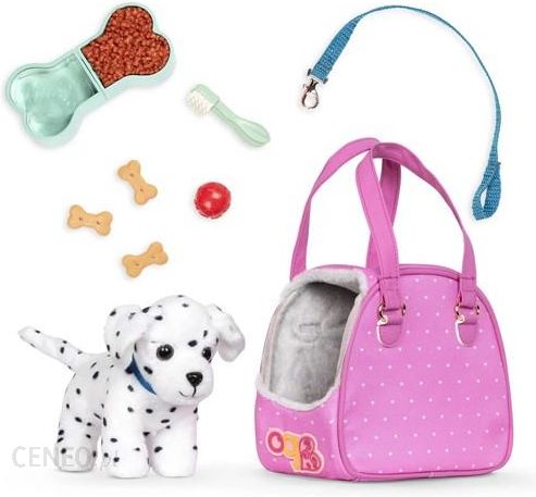 PLUSZOWY SZCZENIAK w ELEGANCKIEJ TOREBCE.Uroczy piesek do pokochania i otoczenia troskliwą opieką.W skład zestawu wchodzą:– pluszowy szczeniak rasy Dalmatyńczyk– elegancka torebka do noszenia pieska, z logo OG– smycz i obroża– miska z wodą i miska z karmą– 3 psie przysmaki w kształcie kostek– piłeczka– szczoteczka do zębów.(lalka widoczna na jednym ze zdjęć nie jest zawarta w zestawie)Dla lalek o wielkości 46cm z serii OurGeneration i lalek podobnej wielkości, a także miłośniczek psów.Kolory i szczegóły mogą się różnić od widocznych na zdjęciach.Zabawka zgodna z europejskimi, kanadyjskimi i amerykańskimi normami bezpieczeństwa zabawek.Przeznaczona dla dzieci w wieku od lat 3.Pieska można prać ręcznie w temp. do 30 stopni.Wymiary: wysokość pieska około 15 cm, długość około 24cm, szerokość do 14cmWymiary torebki: około 20cm (z pieskiem około 27cm) x 17,5cm (z uchwytami około 30cm) x 11cmZabawka wyposażona przez producenta jedynie w przywieszkę produktową, bez dedykowanego opakowania.W ramach serii OurGeneration dostępne są różne modele lalek o wysokości 46cm oraz liczne, atrakcyjne zestawy ubranek i akcesoriów urozmaicających zabawę tymi lalkami – POLECAMY!