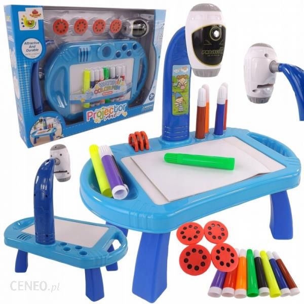PROJEKTOR DO RYSOWANIA NA NÓŻKACH, 32 SLAJDY + PISAKI, RZUTNIIK NA ŚCIANĘ, 22088-17BŚliczny projektor do rysowania to idealna zabawka dla Twojego Małego Artysty.Rozwijaj wyobraźnię, zdolności manualne i artystyczne Twojego dziecka od najmłodszych lat.Nauka poprzez zabawę to najlepsza metoda.Wymiary opakowania: 38 x 29 x 6,5 cmWymiary projektora: 35 cm (wys.) x 32 cm (szer.) x 20 cm (gł.)Wymiary powierzchni do malowania: 19 cm x 12,5 cmWysokość do powierzchni do malowania: 12,5 cmWymiary bloku: 15 cm x 12 cmŚrednica krążków: 3 cmDługość mazaków: 9 CMBaterie: 3 x bateria guzikowa (w zestawie)Wiek: 3+Zabawka posiada certyfikat CE, EN71.W skład zestawu wchodzi:Projektor z z podstawą do rysowania i 4 nóżkami4 krążki ze slajdami. Każdy krążek posiada 8 obrazków, razem daje to aż 32 różne wzory!8 kolorowych mazakówBlok do rysowaniaObrazki na slajdach:Świat zwierząt: ślimak, krowa, koala, dinozaur, sowa, lew, słoń, papugaPodmorski świat: rybka tropikalna, rybka morska, wieloryb, żółw, rekin, krab, ryba nadymka, rakRuch publiczny: skuter, ciężarówka, rower, samolot, traktor, autobus, pociąg, samochódWszechświat: 2 różne rakiety, 2 kosmitów, 3 statki kosmiczne, satelita1.Główka posiada włącznik on/off.Po przyciśnięciu włącznika oświeca się światło. Główka jest ruchoma (góra-dół, prawo-lewo.2. Pod spodem główki znajduje się regulacja ostrości obrazu.3. Do główki wkładamy krążki ze slajdami.4. Po włączeniu projektora zaświeca się światełko, po włożeniu krążka wyświetlają się slajdy. Slajdy można wyświetlać na podstawie projektora i odrysowywać w notesiku albo bezpośrednio na podstawie.5. Podstawa projektora posiada specjalne miejsce na przechowywanie mazaków oraz krążków ze slajdami.6.Podstawa posiada uchwyt do wygodnego transportowania.7. Projektor posiada 4 krążki ze slajdami. Każdy krążek posiada 8 obrazków, razem daje to aż 32 różne wzory!8. W zestawie znajduję się również 8 kolorowych mazaków.9. Dzięki umieszczonemu w zestawie blokowi do pisania bez problemu można uwieczniać rysunki.Funkcje:Główka posiada włącznik on/off. Po przyciśnięciu włącznika oświeca się światło. Główka jest ruchoma (góra-dół, prawo-lewo.Pod spodem główki znajduje się regulacja ostrości obrazu.Do główki wkładamy krążki ze slajdami.Po włączeniu projektora zaświeca się światełko, po włożeniu krążka wyświetlają się slajdy. Slajdy można wyświetlać na podstawie projektora i odrysowywać w notesiku albo bezpośrednio na podstawie.Można również skierować projektor na ścianę i wyświetlać na ścianie slajdy.Projektor może również pełnić funkcję lampki.Podstawa projektora posiada specjalne miejsce na przechowywanie mazaków oraz krążków ze slajdami.Podstawa posiada uchwyt do wygodnego transportowania.Zabawka zapakowana w ładne kolorowe pudełko z okienkiem, idealnie nadaje się na prezent….