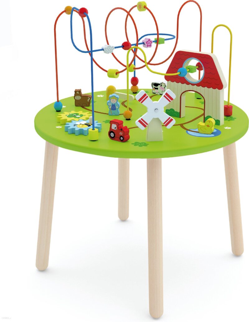 STOLIK EDUKACYJNY FARMA dzięki swojemu rozmiarowi i funkcjonalności zapewni zabawę nawet kilkorgu dzieciom, zachęcając do kreatywności, rozwijając jednocześnie ich umiejętności koordynacji ręka-oko.Zabawa na farmie może polegać na przesuwaniu kolorowych koralików po trzech specjalnie wyprofilowanych torach biegnących przez cały teren gospodarstwa. Również na blacie jest sporo „do roboty”. Należy przesuwać drewniane postacie, zwierzątek lub urządzeń po liniach w miejsca przeznaczenia, np. dla krówek jest to łąka, a kaczuszki – staw. W drodze na pastwisko znajduje się ruchomy szlaban, który trzeba podnieść, aby wpuścić krówki. Na łące umieszczono również dwie ruchome zębatki z wizerunkiem żabki i pszczółki, którymi dzieci będą mogły kręcić. Dodatkowo na farmie jest wiatrak z ruchomymi łopatami.Dwulatek rozwija swoje zdolności manualne, koordynację ruchową, orientację, znajomość przedmiotów, kształtów, barw, skojarzeń, a ta nauka nie jest nudna dzięki wspaniałej zabawie.Całość wykonana została z drewna pomalowanego nietoksycznymi farbami o żywych barwach, które przyciągną wzrok oraz zachęcą do zabawy dając jednocześnie mnóstwo radości z zabawy.Naszym priorytetem jest bezpieczeństwo dzieci oraz najwyższa jakość zabawek, dbamy zatem o to, aby farby którymi malujemy nasze zabawki nie były toksyczne i spełniały normy bezpieczeństwa (EN71 i ASTM).Zabawka przeznaczona dla dzieci powyżej 24 miesięcy.Wymiary produktu:dł: 810mm x szer: 810mm x wys: 600mm